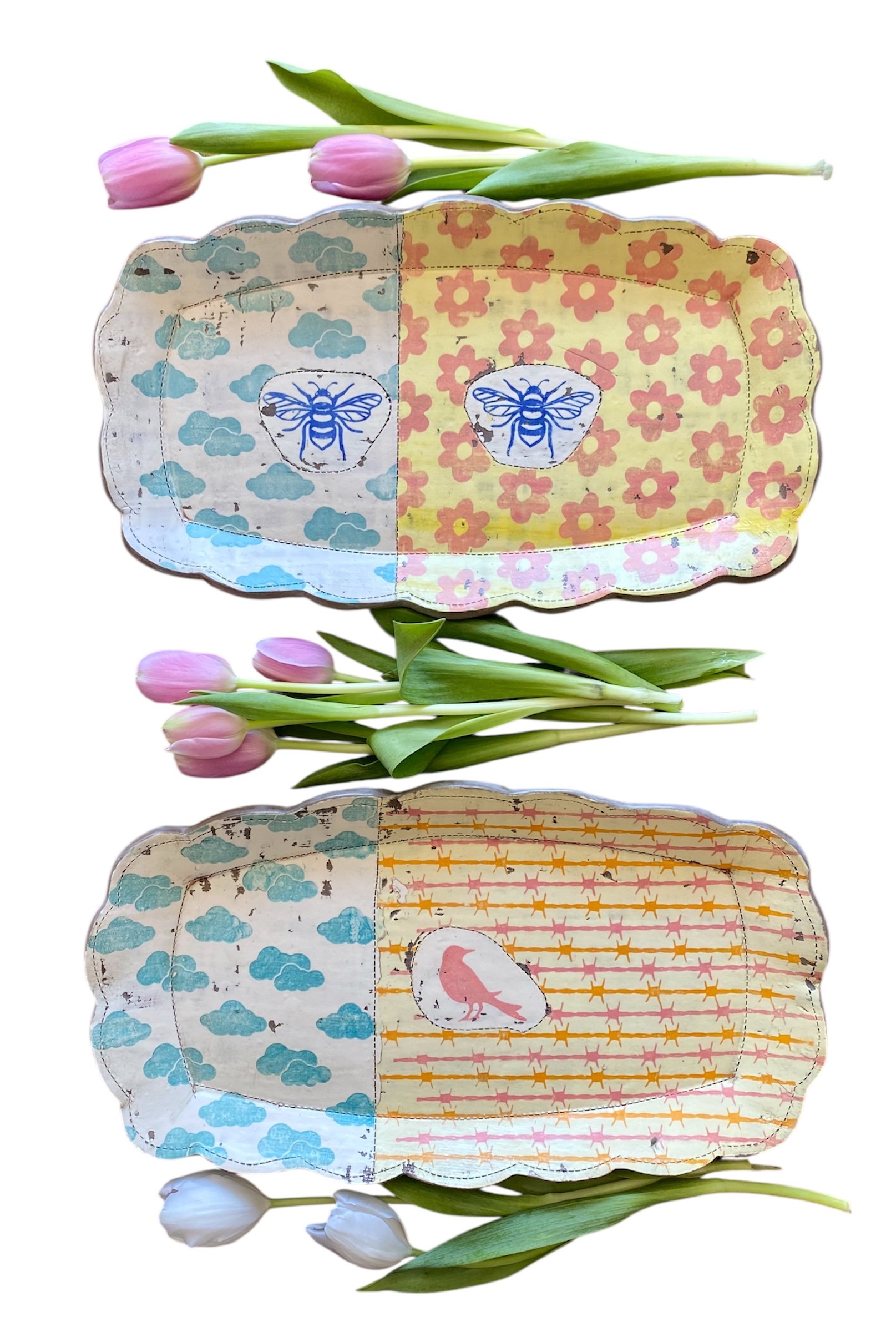 No longer willing to blend in, my work today is full of bright colors; florals, barbed wire, bombs, my menagerie of sacred shapes, animal imagery and vintage toys adorn everyday wares. While initially whimsical and nostalgic, these images are carefully chosen and paired to invite dialogues on immigration, environmental and social justice issues.